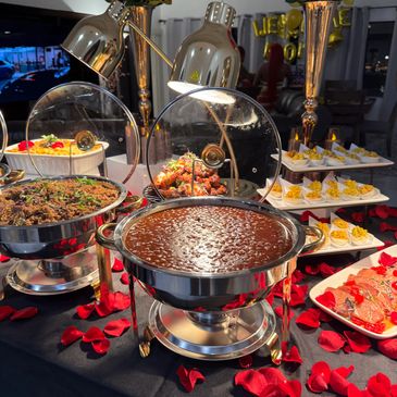 Delight your guests with our beautifully arranged buffet setup, designed to impress and indulge. From vibrant salads to gourmet entrées and decadent desserts, every dish is artfully presented for a feast that’s as visually stunning as it is delicious. Whether it’s a wedding, corporate event, or private celebration, our buffet setup combines style, variety, and seamless service to create a memorable dining experience.